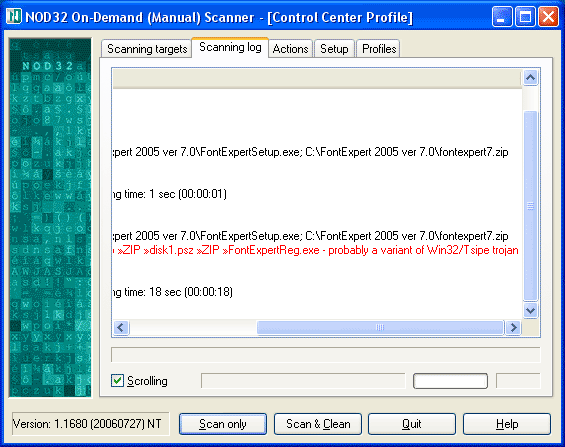 If you use advanced "Heuristics" and "Advanced Heuristics" options, NOD32 antivirus may incorrectly suspect a virus in FontExpertReg registration utility included in FontExpert distribution files: "FontExpertReg.exe - probably a variant of Win32/Tsipe troyan".